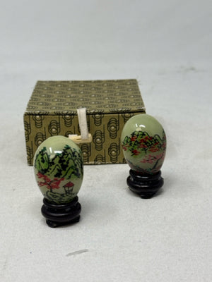 Vintage 2" Miniature Hand Painted Oval Jade Statues with Wooden Stands
